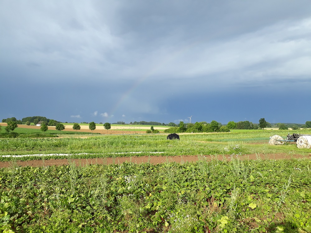 ...Nachdem sich der Sommer zu Beginn wiederholt trocken zeigte und schlimme Erinnerungen an 2018 lebendig werden ließ, konnten wir uns in den folgenden Monaten wenigstens über den einen oder anderen Liter Regen freuen. Mittlerweile sind wir in der Hochsaison angekommen und hoffen auf einen guten Ertrag. Neben Kartoffeln, Getreide, Möhren und Roter Bete, hat auch die Kürbisernte begonnen. Unsere Lager beginnen sich zu füllen. Es ist aber nach wie vor viel zu trocken, was gerade dem Winterkohl und den Möhren zusetzt. Da wir nicht akzeptieren wollen, dass Dürreperioden, Wassermangel und andere Wetterextreme zum Dauerzustand werden, wollen wir an dieser Stelle auf den Klimastreik am Freitag in Bielefeld aufmerksam machen. Auch wir werden mit von der Partie sein. In der Hoffnung, dass wir auch 2025 noch Bilder davon machen können, wie wunderschön unsere Felder nach einem Sommerregen aussehen.